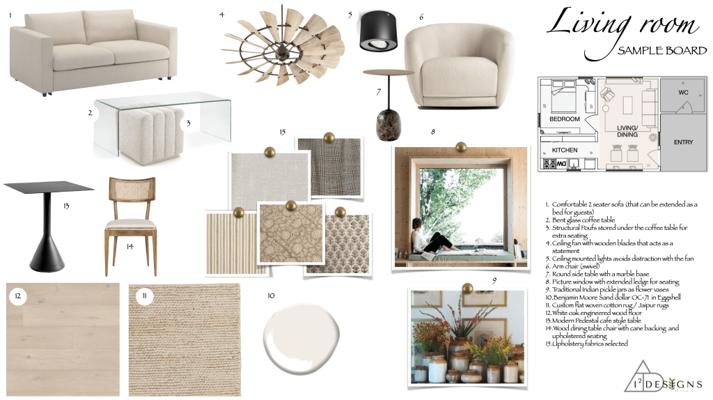 The colour palette was chosen with warm neutral colours. Natural wood in white washed oak finish was used throughout the space to bring in harmony to the space. The upholstery fabrics and decor were sourced locally. To invoke a sense of interest to the space, a mixture of floral and geometric patterns were chosen for the fabrics. The furniture was designed to make the space look modern and custom made to suit the dimensions of the room.